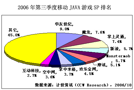 計(jì)世資訊(CCW Research)數(shù)據(jù)顯示,2006年第三季度中國手機(jī)游戲市場規(guī)模達(dá)到6.7億元人民幣,比第二季度增長11.9%。 手機(jī)游戲市場規(guī)模包括移動(dòng)運(yùn)營商、手機(jī)游戲服務(wù)提供商在手機(jī)游戲業(yè)務(wù)上的總體收入,但不包括手機(jī)游戲軟件開發(fā)商的收入。第三季度,短信游戲增速繼續(xù)放緩,短信游戲市場規(guī)模達(dá)到1.8億元,占手機(jī)游戲市場份額的26.5%。WAP,JAVA和BREW游戲繼續(xù)保持快速增長,第三季度WAP、JAVA和BREW游戲市場規(guī)模分別為2.8億元、1.4億元和0.7億元。