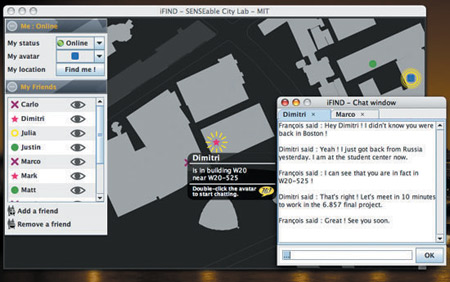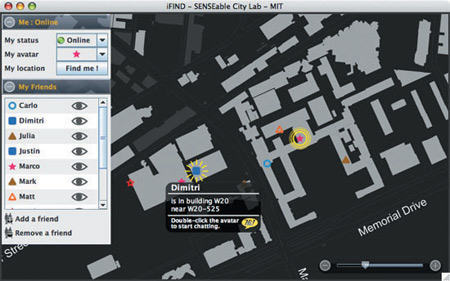 該軟件名為iFind,乍一看類(lèi)似任何典型的即時(shí)通信軟件,也需要雙方相互邀請(qǐng),這樣才能進(jìn)入對(duì)方的好友名單。用戶(hù)可以選擇暫時(shí)隱藏起來(lái),不讓某個(gè)好友或者整個(gè)群組看見(jiàn)自己,他們還可以完全把某人從好友名單中刪除。不過(guò)iFind的好友名單增加了地圖,可以實(shí)時(shí)顯示這些朋友在MIT校園的哪個(gè)角落。地圖顯示了通過(guò)Wi-Fi登錄到MIT網(wǎng)絡(luò)上的好友,讓用戶(hù)可以為每個(gè)朋友創(chuàng)建獨(dú)特的迷你頭像,能看到誰(shuí)在學(xué)校河邊閑逛、誰(shuí)在樓上圖書(shū)館看書(shū)。