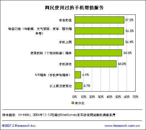 中國(guó)移動(dòng)的增值業(yè)務(wù)已經(jīng)發(fā)展到一個(gè)相對(duì)成熟的階段,增值業(yè)務(wù)對(duì)整體業(yè)務(wù)的貢獻(xiàn)度有望進(jìn)一步提高,2006年中國(guó)移動(dòng)增值收入比例達(dá)到23.5%。中國(guó)移動(dòng)的增值業(yè)務(wù)收入構(gòu)成目前還比較單一,短信占主導(dǎo)。WAP/MMS/Java等2.5G業(yè)務(wù)將從2007年開始進(jìn)入高速發(fā)展階段,而CRBT和IVR則將逐漸進(jìn)入成熟期與調(diào)整期,增長(zhǎng)速度趨緩。iResearch艾瑞市場(chǎng)咨詢通過對(duì)用戶研究發(fā)現(xiàn),彩信、短信、WAP、彩鈴及手機(jī)游戲最受用戶青睞,彩信、短信訂閱、手機(jī)上網(wǎng)、彩鈴及手機(jī)游戲是用戶使用最多的移動(dòng)增值業(yè)務(wù)。