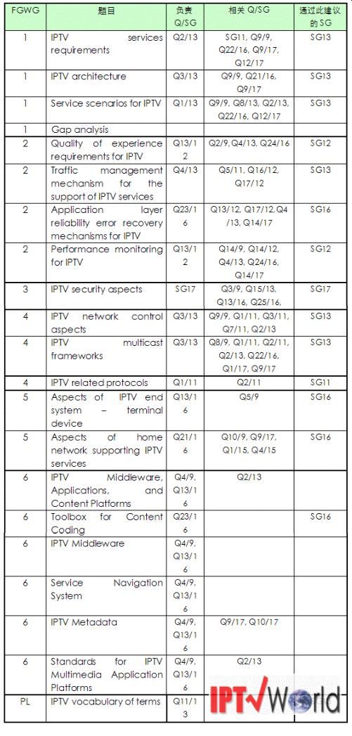 表2:FG IPTV輸出的工作文檔以及負(fù)責(zé)此文檔后續(xù)工作的ITU-T研究組