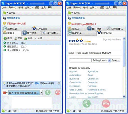 近日,許多貿(mào)易人士在登陸全球貿(mào)易推廣服務(wù)商ECVV的網(wǎng)站時,發(fā)現(xiàn)新增了一項(xiàng)方便貿(mào)易人士在線交流的服務(wù),即“Skype-ECVV貿(mào)易版”。