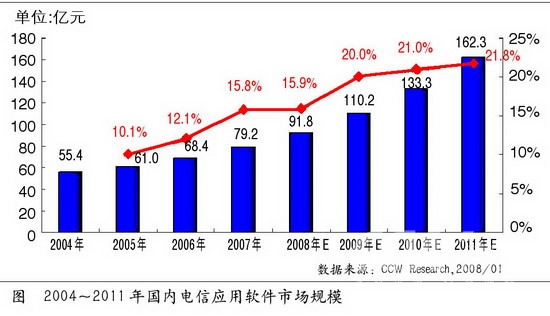 3G是中國未來通信建設(shè)的重點(diǎn)。隨著3G發(fā)展趨勢逐漸明朗化,為了有效地對3G網(wǎng)絡(luò)進(jìn)行支撐和管理,針對3G業(yè)務(wù)的IT系統(tǒng)建設(shè)也逐漸成為運(yùn)營商信息化的重點(diǎn)建設(shè)項(xiàng)目。BSS、OSS和MSS將成為這次建設(shè)的主要方向,今后相當(dāng)長的一段時間內(nèi),計費(fèi)賬務(wù)系統(tǒng)、經(jīng)營分析與決策系統(tǒng)、網(wǎng)絡(luò)資源管理系統(tǒng)、客戶關(guān)系管理系統(tǒng)等將成為國內(nèi)電信運(yùn)營商建設(shè)或規(guī)劃的重點(diǎn)。根據(jù)計世資訊調(diào)查顯示,2007~2011年,在3G建設(shè)全面展開后,電信應(yīng)用軟件市場的市場規(guī)模累積將達(dá)到將近500億元的市場份額。