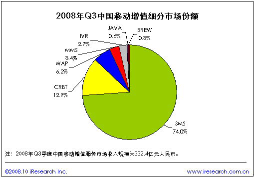 根據(jù)iResearch艾瑞咨詢最新出版的《2008年第三季度中國移動(dòng)增值行業(yè)發(fā)展報(bào)告》數(shù)據(jù)顯示,2008年第三季度中國移動(dòng)增值服務(wù)市場規(guī)模達(dá)332.4億元,同比增長40.2%.其中短信市場規(guī)模以74.0%的比例位居第一,CRBT和WAP分別以12.9%和6.2%的份額居第二、第三。