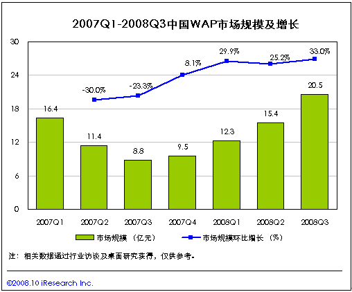 艾瑞咨詢研究發(fā)現(xiàn),2008年第三季度,WAP總體市場規(guī)模為20.5億,環(huán)比增長33.0%.其中,中國移動(dòng)官方WAP市場規(guī)模為18.6億,環(huán)比增長27.1%,中國聯(lián)通官方WAP市場規(guī)模為1.88億,環(huán)比增長24.8%。