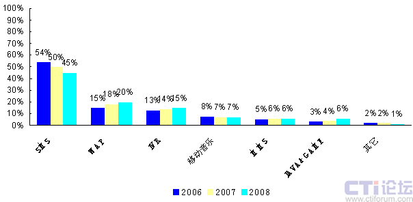 圖1 2006~2008年中國移動(dòng)數(shù)據(jù)業(yè)務(wù)市場結(jié)構(gòu)(單位:%)