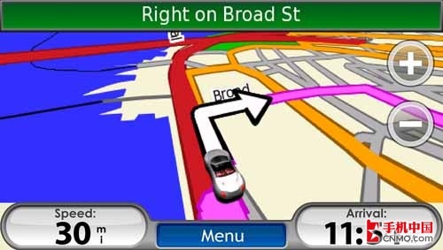 色彩豐富的界面、臨場感十足的導(dǎo)航界面,是Garmin Nuvifon帶給用戶的全新導(dǎo)航體驗。用超酷的跑車來表現(xiàn)目前用戶所處的方位,極具創(chuàng)意之余也更加直觀;用戶也可通過觸摸虛擬按鍵來實現(xiàn)地圖的放大縮小。