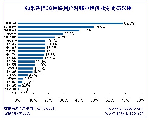 據(jù)易觀Enfodesk《中國3G市場(chǎng)用戶調(diào)研報(bào)告2009》研究發(fā)現(xiàn),可視電話成為最受用戶歡迎的增值業(yè)務(wù),除此之外,高速移動(dòng)寬帶業(yè)務(wù)和高清晰語音受用戶選擇比例也較高,分別達(dá)到49.5%和40.2%。與此相反的是,手機(jī)社區(qū)、手機(jī)博客和殺毒/安全業(yè)務(wù)受歡迎程度最小。