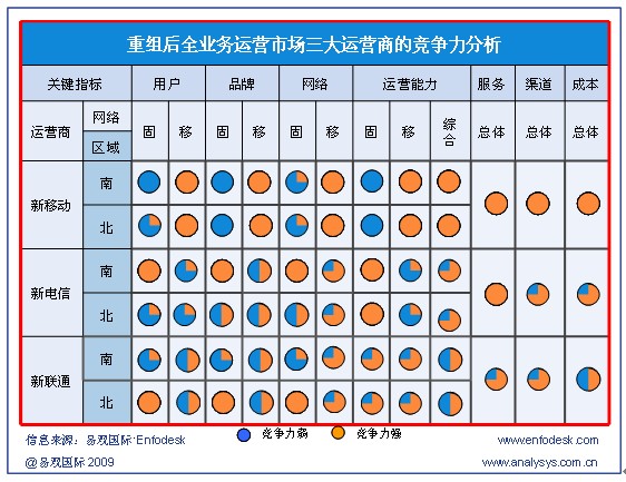 盡管產(chǎn)業(yè)鏈完備程度相差較為明顯,但運(yùn)營商各自業(yè)務(wù)與用戶服務(wù)運(yùn)營能力對(duì)3G時(shí)常的發(fā)展影響也至關(guān)重要,根據(jù)易觀國際Enfodesk發(fā)布的《國內(nèi)運(yùn)營商3G業(yè)務(wù)發(fā)展策略研究系列—中國3G市場現(xiàn)狀與發(fā)展策略概述》報(bào)告顯示,在發(fā)展3G的過程中,三大運(yùn)營商各自有一定的優(yōu)劣勢(shì):