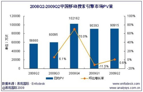 而對(duì)于中國(guó)移動(dòng)搜索引擎的PV進(jìn)行統(tǒng)計(jì)發(fā)現(xiàn):2009年第2季度中國(guó)移動(dòng)搜索因此市場(chǎng)日均PV量達(dá)9.09億次,環(huán)比增長(zhǎng)0.6%,相比去年同期增長(zhǎng)60%。而2009年隨著總體搜索量的增長(zhǎng)PV量不增反減,主要?dú)w因于搜索精確度的大大提升減少用戶單次搜索請(qǐng)求所帶來(lái)的PV量,另一方面用戶對(duì)網(wǎng)頁(yè)之外的音樂(lè)、圖片、軟件等內(nèi)容的搜索請(qǐng)求數(shù)增多,但此類內(nèi)容的單次搜索所帶來(lái)的PV明顯小于網(wǎng)頁(yè)搜索所帶來(lái)的PV。
