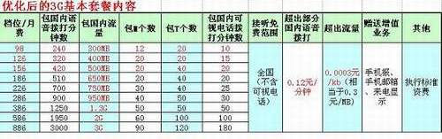 據(jù)了解,正式商用資費包含9個等級,從98元-886元不等,取消了試商用期間最高的1686元套餐,新增了98元、126元和156元三項套餐,超出套餐的語音資費也由原來的0.36元-0.24元/分鐘不等,調整為統(tǒng)一的0.12元/分鐘,比之試商用期間的半價資費還要低。