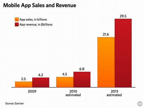 Gartner預(yù)計,2010年的應(yīng)用銷量將達到45億,收入為68億美元。如果蘋果保持現(xiàn)有的速度,即每月銷售2500萬個應(yīng)用,其全年銷量將達到3億,市場份額為67%。蘋果應(yīng)用商店2010年的收入則有望達到45億美元,其中蘋果的分成約為13.5億美元,其余則歸開發(fā)者所有。然而,隨著新款iPhone和平板電腦的上市,蘋果有望吸引更多的用戶,從而對應(yīng)用下載量起到提升作用,市場份額也將有所增加