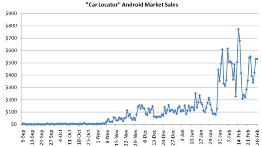 在被Android應用商店列為特別應用前,“汽車定位器”每天獲得的收入約為80至100美元。此后,其銷售額便大幅增加,平均每天達到435美元,情人節(jié)那天更是達到創(chuàng)紀錄的772美元。