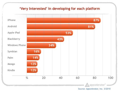 根據(jù)報(bào)道,在2010年1月,有86%的開(kāi)發(fā)者非常有興趣開(kāi)發(fā)iPhone應(yīng)用程序,而68%的開(kāi)發(fā)者非常有興趣開(kāi)發(fā)Android程序,差距是18%。而在3月時(shí),這個(gè)差距縮小到6%(iPhone 87%、Android 81%,iPad是53%)。