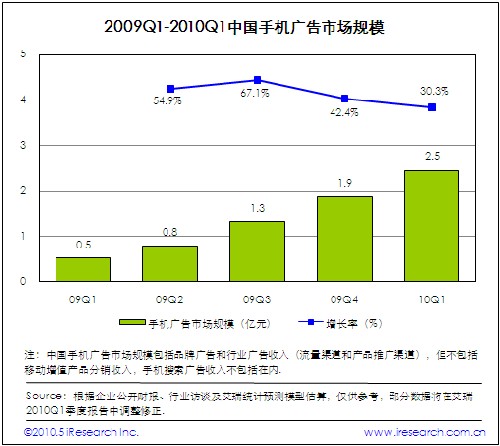 2010Q1中國(guó)手機(jī)廣告市場(chǎng)規(guī)模達(dá)到2.5億,環(huán)比增長(zhǎng)30.3%.受季節(jié)性因素影響,手機(jī)廣告市場(chǎng)增速放緩,但是保持增長(zhǎng)發(fā)展態(tài)勢(shì)。本季度,新聞、體育、數(shù)碼、女性和汽車(chē)類(lèi)手機(jī)廣告市場(chǎng)表現(xiàn)良好,文本、橫幅、全屏以及客戶端軟件等手機(jī)廣告形式受到廣告主青睞。針對(duì)不同受眾群體進(jìn)行多重定向廣告營(yíng)銷(xiāo)成為更多手機(jī)廣告服務(wù)提供商的實(shí)踐方向。盡管本季度手機(jī)廣告市場(chǎng)取得良好的市場(chǎng)表現(xiàn)力,但是廣告定價(jià)和廣告效果評(píng)估等制約手機(jī)廣告市場(chǎng)發(fā)展的關(guān)鍵因素仍將長(zhǎng)期存在。