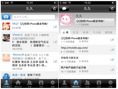 QQ空間foriPhone的外觀界面完全繼承了iPhone上應(yīng)用軟件的清新簡潔風(fēng)格,軟件主界面包括個人中心、我的主頁、好友、應(yīng)用、設(shè)置五大功能。點擊個人中心可以看到自己的狀態(tài)、簽名以及好友的最新動態(tài)。并且可以直接使用置頂?shù)呐恼真I拍照,即時拍照上傳至空間,使用置頂?shù)男那檩斎肟蛴涗涀约旱男那椤?br />