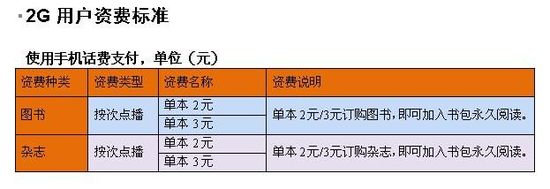 據(jù)了解,中國聯(lián)通手機(jī)閱讀業(yè)務(wù)只針對(duì)聯(lián)通網(wǎng)內(nèi)手機(jī)用戶,采用按次點(diǎn)播(按本訂購)的資費(fèi)標(biāo)準(zhǔn)。同時(shí),2G用戶和3G用戶采用不同的支付方式,2G用戶使用手機(jī)話費(fèi)支付,3G用戶使用M/T支付。