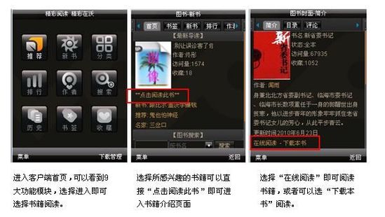 據(jù)了解,中國聯(lián)通手機(jī)閱讀業(yè)務(wù)分為三個(gè)專區(qū)。目前,圖書頻道包括16類24000余本圖書,雜志頻道包括17類500余本雜志。此外,用戶可選擇進(jìn)入聽書頻道,下載并收聽圖書。