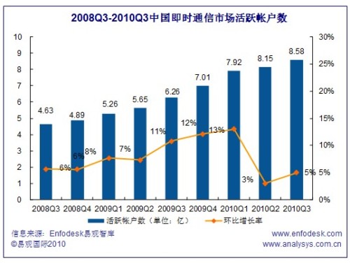 2010Q3中國即時通信市場活躍帳戶數(shù)超過8.58億