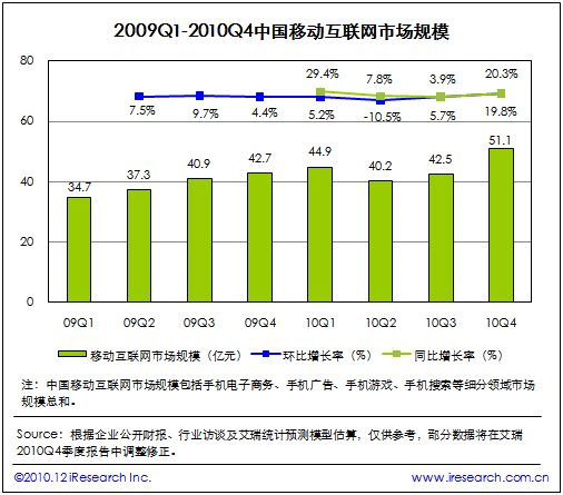 根據(jù)艾瑞咨詢即將發(fā)布的2010年第四季度中國移動互聯(lián)網(wǎng)市場監(jiān)測數(shù)據(jù)顯示,2010Q4中國移動互聯(lián)網(wǎng)市場整體規(guī)模達到51.1億,同比增長19.8%,環(huán)比增長20.3%。艾瑞咨詢分析認為,本季度電信運營商對計費通道治理開始收尾,移動增值市場整體復蘇。同時手機電子商務、手機游戲業(yè)務領域取得良好市場表現(xiàn),受手機應用商店、位置簽到服務等新型手機業(yè)務創(chuàng)新的帶動,移動互聯(lián)網(wǎng)規(guī)模總體攀升,投融資比重增加。