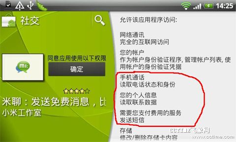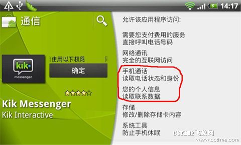 國(guó)內(nèi)外Kik類(lèi)應(yīng)用也逐漸興起,騰迅最近也加入此陣營(yíng)并推出其下產(chǎn)品微信。Kik類(lèi)應(yīng)用主要以用戶(hù)手機(jī)中聯(lián)系人目錄為主要的關(guān)系抓取,只要其聯(lián)系人中裝入該客戶(hù)端,用戶(hù)無(wú)需特意添加即可開(kāi)始類(lèi)似短信的聊天。以KikMessenger為例,其中便涉及讀取用戶(hù)聯(lián)系人信息、電話狀態(tài)和身份等權(quán)限。