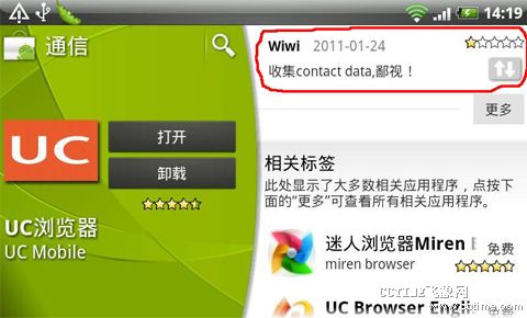 目前,很多手機(jī)社交應(yīng)用中加入了對(duì)用戶(hù)關(guān)系的抓取,這些應(yīng)用在用戶(hù)需要尋求社交關(guān)系時(shí),將讀取用戶(hù)通訊錄中的信息,并進(jìn)行自動(dòng)匹配。其中包括手機(jī)廠商HTC的HTCSENSE,UCWEB中的UC樂(lè)園,以及最近火熱的kik類(lèi)應(yīng)用,如KikMessenger,米聊、微信等。多數(shù)用戶(hù)表示對(duì)于此種抓取通訊錄的行為表示疑慮。