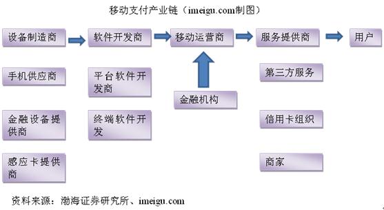 移動支付業(yè)務產(chǎn)業(yè)鏈主體由設備制造商、銀行、信用卡組織、移動運營商、移動支付服務提供商(或移動支付平臺運營商)、商業(yè)機構、SIM卡供應商、手機供應商、用戶等多個環(huán)節(jié)組成。