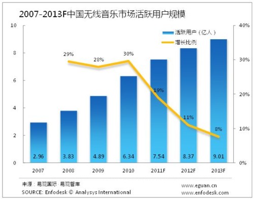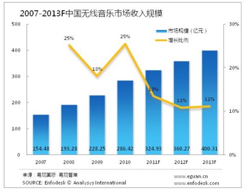 2011年整體無線音樂市場格局仍會保持相對穩(wěn)定。但整體市場規(guī)模,及無線音樂用戶數的增速會略有下降。易觀國際(Analysys International)預計2013年收入規(guī)模達到400個億,2013年無線音樂活躍用戶達到9.95億人。