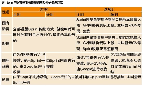 選項(xiàng)2中,話音和短信業(yè)務(wù)都交由GV網(wǎng)絡(luò)進(jìn)行接續(xù),Sprint只負(fù)責(zé)用戶到關(guān)口局的本地接入段,這時(shí)候使用的是GV的VoIP業(yè)務(wù)。因此,選項(xiàng)2才可以稱得上是深度整合;同時(shí),由于GV使用的是固網(wǎng)碼號(hào),雙方的整合其實(shí)已經(jīng)屬于FMC的范疇了。表1是對(duì)上述兩種方式的具體分析。