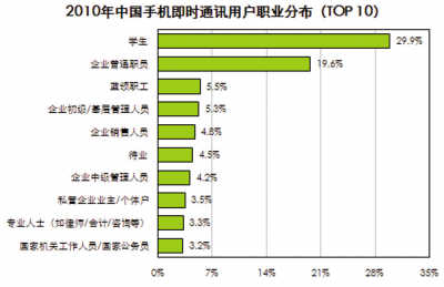 一系列研究數(shù)據(jù)足以說明些問題。研究公司艾瑞咨詢報告數(shù)據(jù)顯示,2010年中國手機上網(wǎng)用戶達(dá)到3.03億,在總網(wǎng)民數(shù)中占比約為66.3%。這其中,57.4%的用戶使用即時通訊服務(wù),位列手機上網(wǎng)用戶十大行為的第二位。