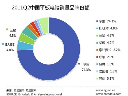 CTI論壇(ctiforum)7月21日消息(記者 楊佳林):根據(jù)易觀智庫(kù)最新數(shù)據(jù)顯示,在2011年第2季度蘋果iPad市場(chǎng)銷量份額環(huán)比下滑5.14%,至74.30%。其次是E人E本,占據(jù)了4.82%。三星位列第三。伴隨品牌平板電腦集體上市,以愛國(guó)者、藍(lán)魔為代表的消費(fèi)類電子廠商的平板電腦均收到一定影響,市場(chǎng)銷量和份額均有不同程度下降。