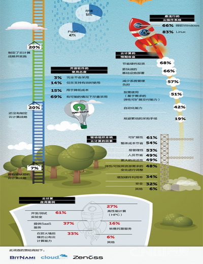 《2011云計算發(fā)展前景調(diào)查報告》的目標(biāo)在于收集企業(yè)用戶中使用虛擬化和云計算技術(shù)的信息,有助于公眾了解云計算技術(shù)及其服務(wù)的演進。這份調(diào)查報告的結(jié)果來自2011年第二季度對BitNami、Cloud.com和Zenoss開源與系統(tǒng)管理社區(qū)中500多位用戶的調(diào)查。其目的是想看清楚云計算技術(shù)的使用趨勢,并對部署虛擬基礎(chǔ)設(shè)施提供參考。