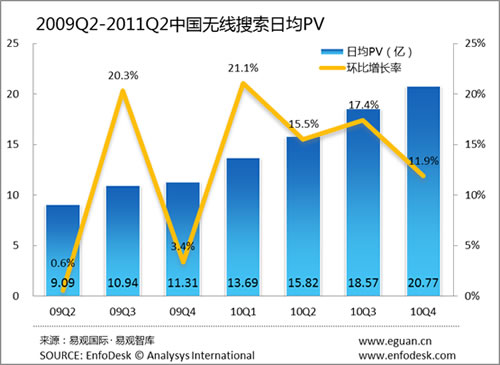 從無線搜索市場(chǎng)的PV來看,2011年第2季度中國無線搜索市場(chǎng)日均PV已經(jīng)突破24億次,環(huán)比上季度增長為11.0%,增長率相比上個(gè)季度開始反彈。