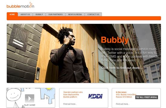 “Bubble Motion”的Bubbly平臺(tái)是一個(gè)手機(jī)端的語音微博服務(wù),允許用戶通過聲音向他們的關(guān)注者和粉絲發(fā)布狀態(tài)信息,模式與Twitter一樣,只是將文字變成了聲音,微博變成了bubbles,用戶將錄制的聲音更新到手機(jī),然后所有粉絲將收到一條短信通知,點(diǎn)擊短信內(nèi)的鏈接就可以收聽。