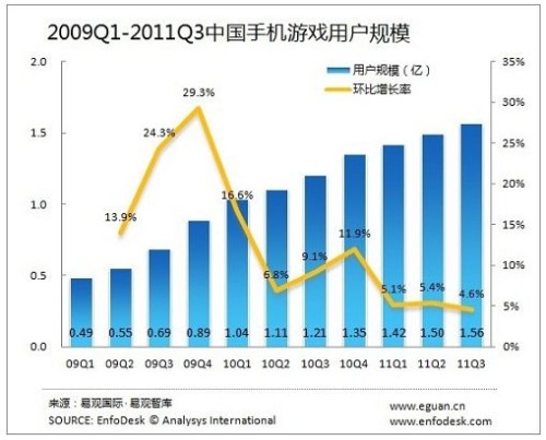 根據EnfoDesk易觀智庫產業(yè)數據庫最新發(fā)布的《2011年第3季度中國手機游戲市場季度監(jiān)測》數據顯示,中國手機游戲用戶規(guī)模穩(wěn)步增長,截止2011年第3季度達1.56億,環(huán)比增長4.6%。