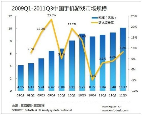 另外,從手機游戲市場規(guī)模來看,2011年第3季度手機游戲市場規(guī)模一舉突破10億大關,達到10.17億,環(huán)比增長8.2%。