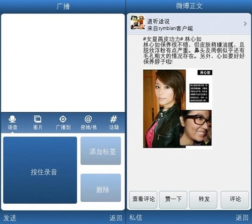 語音微博1.6 for Symbian新加入的私信和經(jīng)驗(yàn)系統(tǒng)的加入使得用戶間信息的交流更緊密、分享更便捷。從此,千里傳音不是夢(mèng)。