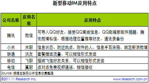 新型移動(dòng)IM(米聊、微信等)建立在手機(jī)通訊錄的基礎(chǔ)上,較以往移動(dòng)QQ、飛信等具有更強(qiáng)的用戶粘性,并且克服了傳統(tǒng)移動(dòng)IM需要反復(fù)登錄、只能發(fā)送文字、圖片等缺點(diǎn)。