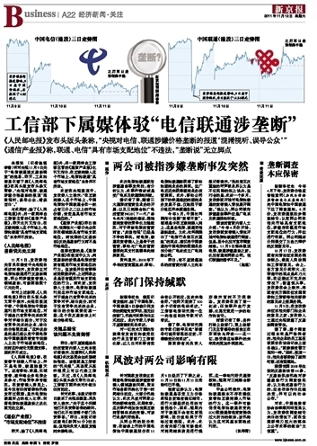 本報(bào)訊 (記者 趙謹(jǐn) 李蕾) 針對央視11月9日關(guān)于“電信聯(lián)通遭反壟斷調(diào)查”的消息,昨天,工業(yè)和信息化部下屬《人民郵電報(bào)》在其頭版發(fā)布頭條文章稱,“央視對電信、聯(lián)通涉嫌價(jià)格壟斷的報(bào)道‘混淆視聽、誤導(dǎo)公眾、錯(cuò)誤百出’!