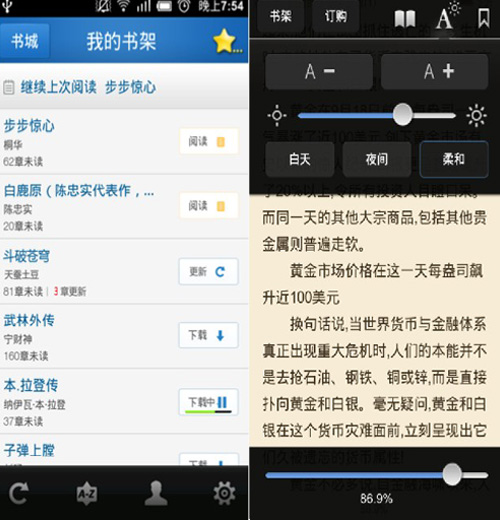 鑒于Android版和iOS版應(yīng)用功能和界面相差不大,我們就說(shuō)說(shuō)Android版本。整個(gè)應(yīng)用主要分為三大部分:書架、閱讀和書城。