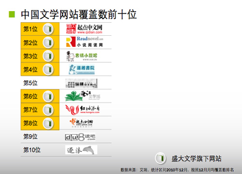 根據(jù)艾瑞咨詢的數(shù)據(jù),中國(guó)文學(xué)網(wǎng)站覆蓋人數(shù)最多的前8個(gè)文學(xué)網(wǎng)站中,盛大旗下文學(xué)網(wǎng)站占了7個(gè),包括排名第一的起點(diǎn)中文網(wǎng)等。