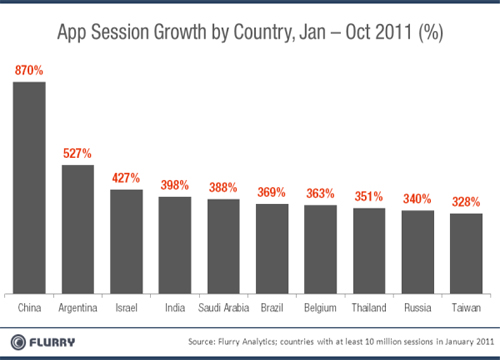 北京時(shí)間11月3日消息,據(jù)國(guó)外媒體報(bào)道,日前,移動(dòng)應(yīng)用分析網(wǎng)站Flurry發(fā)表分析文章稱,iOS和Android移動(dòng)應(yīng)用的下載量不斷增加,而中國(guó)的移動(dòng)應(yīng)用下載量和新應(yīng)用需求更是迅猛增長(zhǎng),中國(guó)已經(jīng)一躍成為全球第二大移動(dòng)應(yīng)用市場(chǎng),全球應(yīng)用開發(fā)者都不可忽視中國(guó)市場(chǎng)。