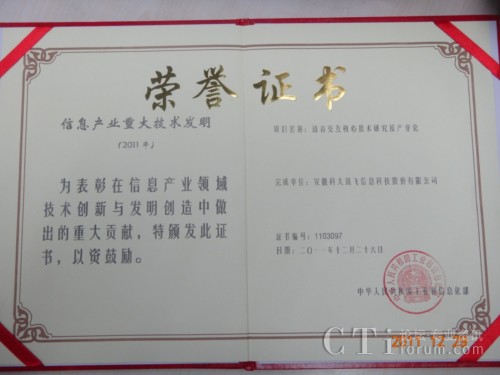 | 訊飛語音識別技術(shù)產(chǎn)品獲CTI論壇編輯推薦獎 2011-12-29 |