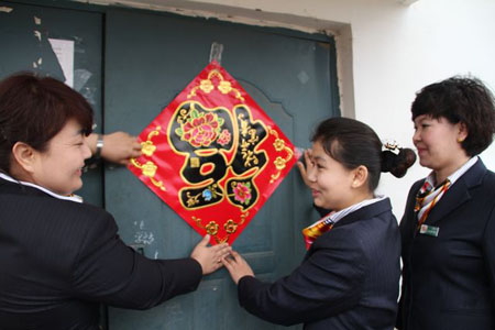 “阿姨,春節(jié)快到了,我們來(lái)看看您,前兩天已經(jīng)幫您把電充上了,這次給您帶了個(gè)手電,用著它以后到地下室可以照個(gè)亮!标(duì)長(zhǎng)阿依古麗向丁阿姨說(shuō)明來(lái)意,還跟丁阿姨試了試,手電是充電式的,不用換電池,丁阿姨挺高興的。臨走時(shí),阿依古麗還在她家門(mén)上貼了個(gè)大紅的“!弊郑8@先思倚履昕鞓(lè)。