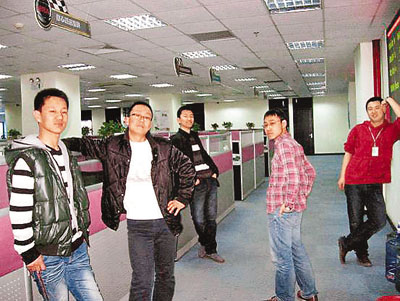 圖:李明磊(左一)與同事們堅(jiān)守在呼叫中心的崗位上 想多賺錢助姐結(jié)婚
