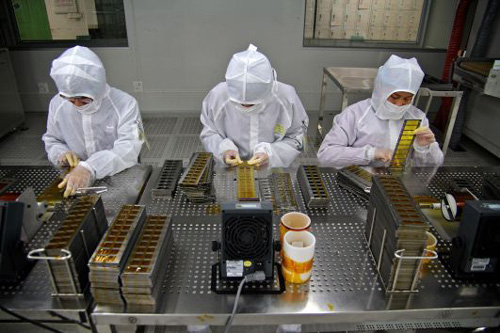 在專門(mén)的無(wú)塵區(qū)中,工人需要穿著防靜電服。在照片中,3名工人正在組裝iPad的攝像頭模組。