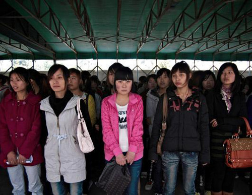 在一個(gè)周一上午,約3000名外來(lái)工人在深圳的富士康招聘中心門(mén)前,希望獲得在富士康的工作機(jī)會(huì)。