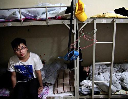富士康一名員工從睡夢(mèng)中醒來(lái),而他的兩名同事仍在繼續(xù)睡覺(jué)。在富士康宿舍中,8名工人共用一個(gè)單間。