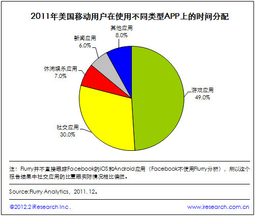 iResearch艾瑞咨詢整理Flurry最新的研究數(shù)據(jù)發(fā)現(xiàn),2011年美國移動用戶花在游戲應(yīng)用上的時間最長,游戲應(yīng)用占據(jù)美國移動用戶應(yīng)用使用總時間的49.0%,其次是社交網(wǎng)絡(luò)應(yīng)用,占30.0%,休閑娛樂應(yīng)用和新聞類應(yīng)用分別為7.0%和6.0%,剩下的其他類型應(yīng)用占據(jù)8.0%。