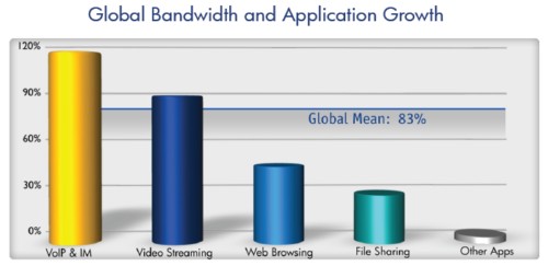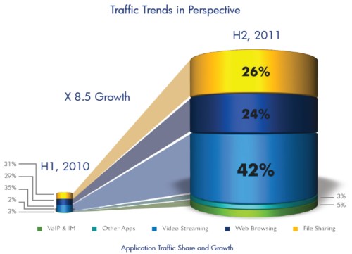 Allot 通訊公司在2012年2月出的報告中,2011年下半年,視頻流媒體在手機流量中始終占著絕對優(yōu)勢,相比2010上半年的占全球帶寬比35%,增長到了42%;網(wǎng)絡共享排第二位,占26%,相比2010上半年下降了31%;同時網(wǎng)頁瀏覽量也有所下降,同期從29%下降到24%;網(wǎng)絡電話與即時訊通在下半年僅僅占了3%。整體來看,全球手機無線業(yè)務流量在下半年相比上半年增長了83%,復合年增長率為234%。