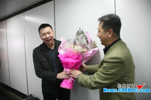 圖1:南航新疆分公司市場銷售部領導迎接“南航優(yōu)秀青年勞務工”李江濤載譽歸來